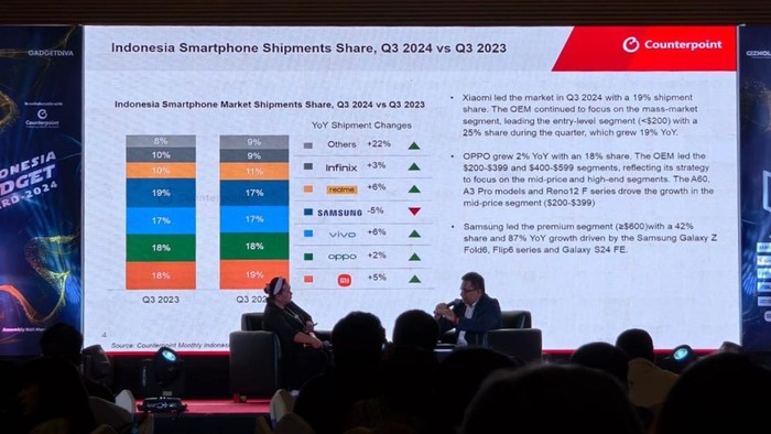 Jakarta - Perusahaan riset Counterpoint merilis laporan pasar HP Indonesia selama kuartal ketiga (Q3) 2024 di ajang Indonesia Gadget Award 2024. Tercatat ada kenaikan 4% dari tahun sebelumnya.