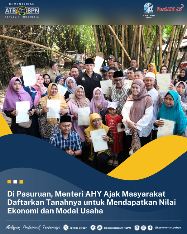 Pasuruan - Menteri Agraria dan Tata Ruang/Kepala Badan Pertanahan Nasional (ATR/BPN), Agus Harimurti Yudhoyono (AHY) mengajak masyarakat untuk mendaftarkan tanahnya agar mendapatkan nilai ekonomi d... Selengkapnya